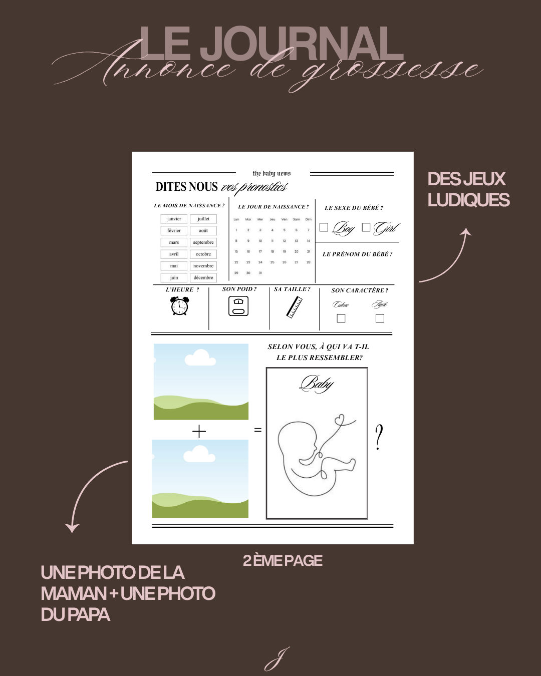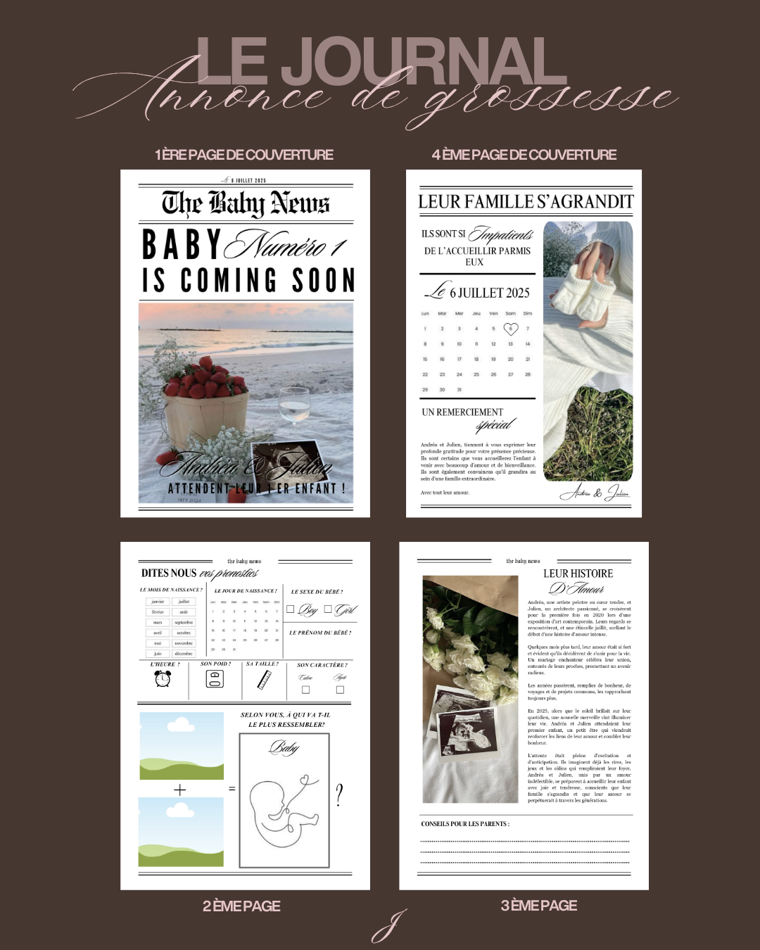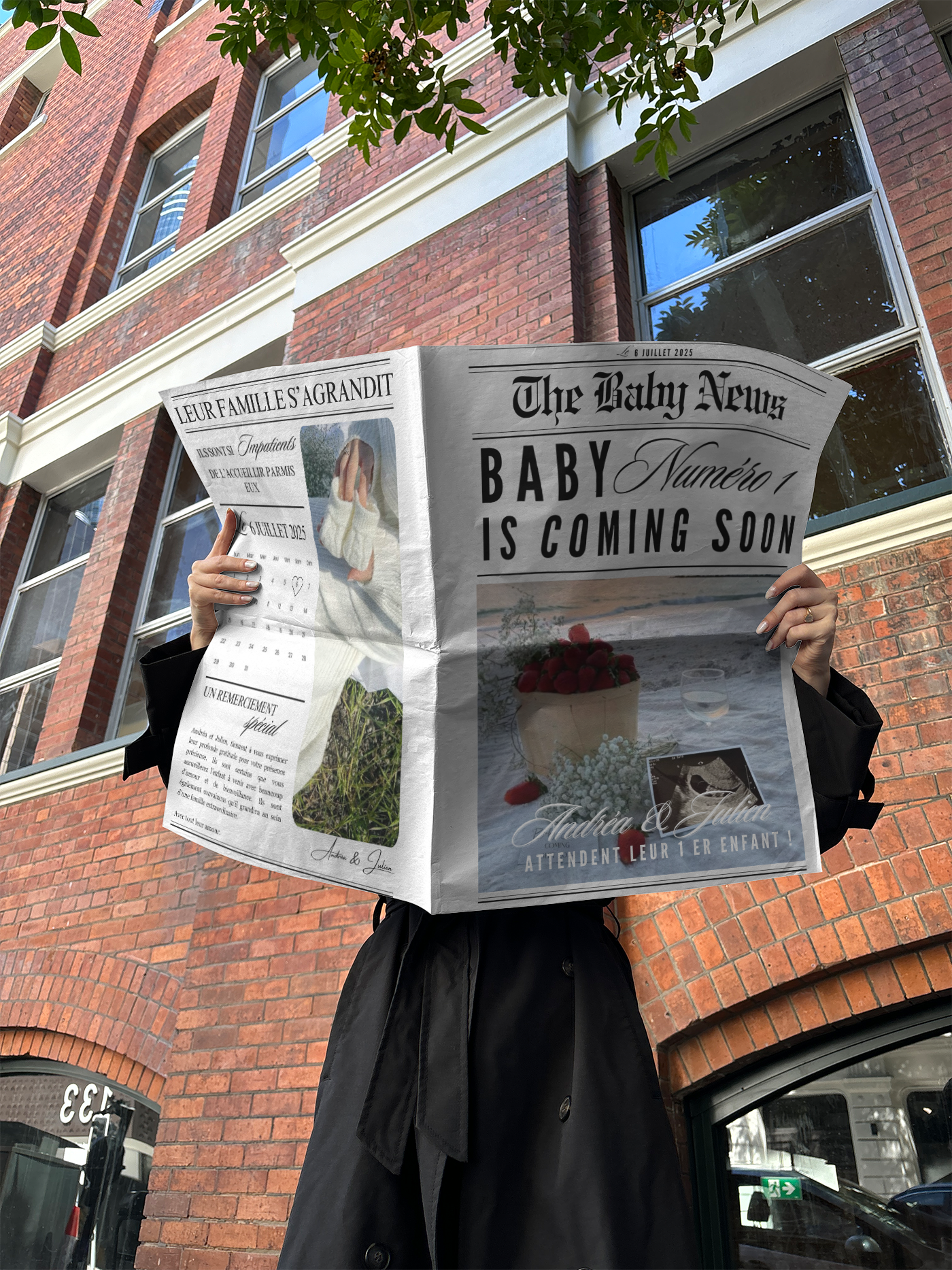 Vous cherchez une façon originale et touchante d’annoncer votre grossesse ? Notre journal annonciateur de grossesse est conçu pour faire de cette annonce un moment unique, plein de surprises et d’émotions.